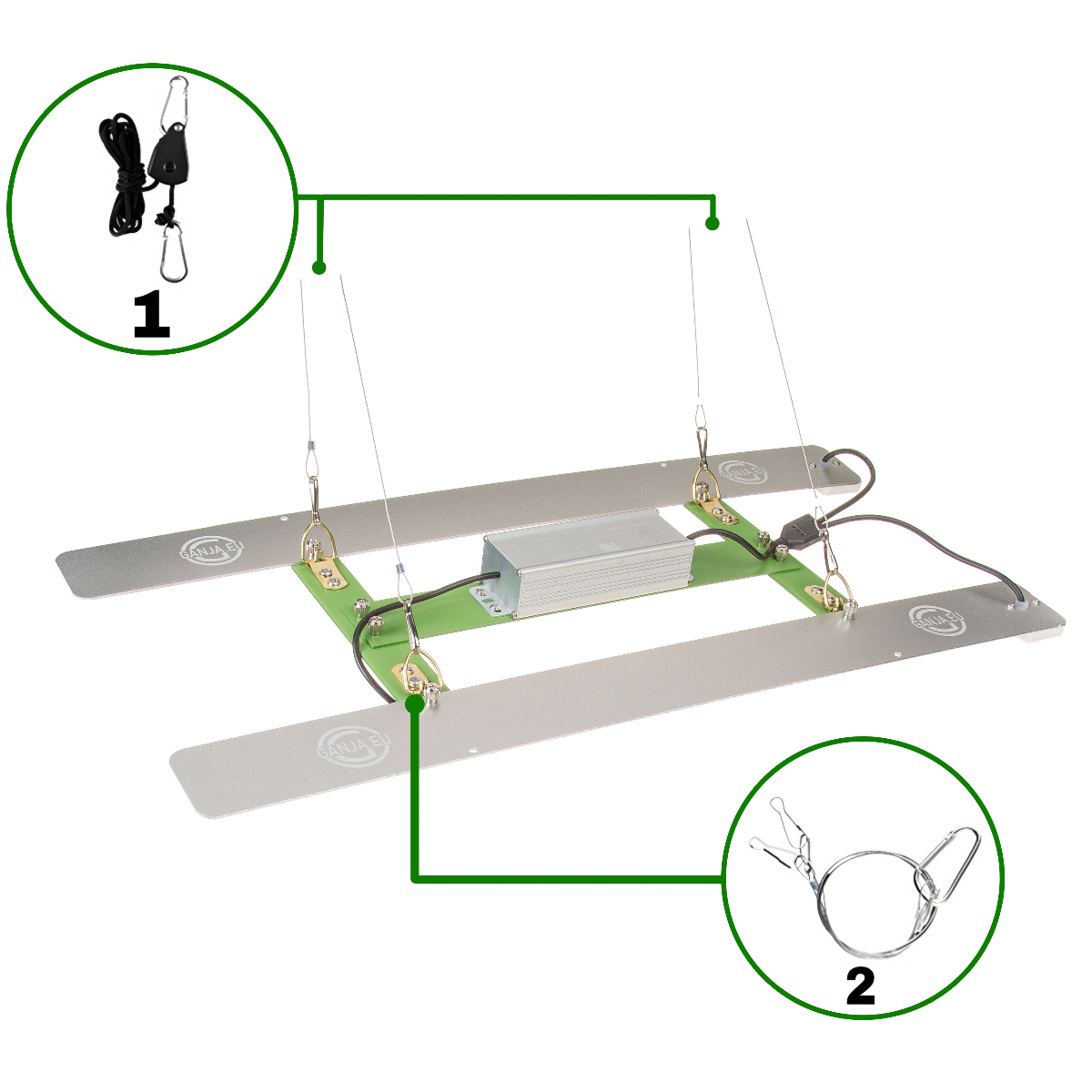Unsere Leuchten werden mit Stahlseilen geliefert, die an einem Punkt mit einem Textilkabel verbunden sind. Dieses ist wiederum mit einem Schnellverstellsystem für die Pendelhöhe ausgestattet. So können Sie schnell die passende Pendelhöhe für das aktuelle Wachstumsstadium Ihrer Pflanze wählen.