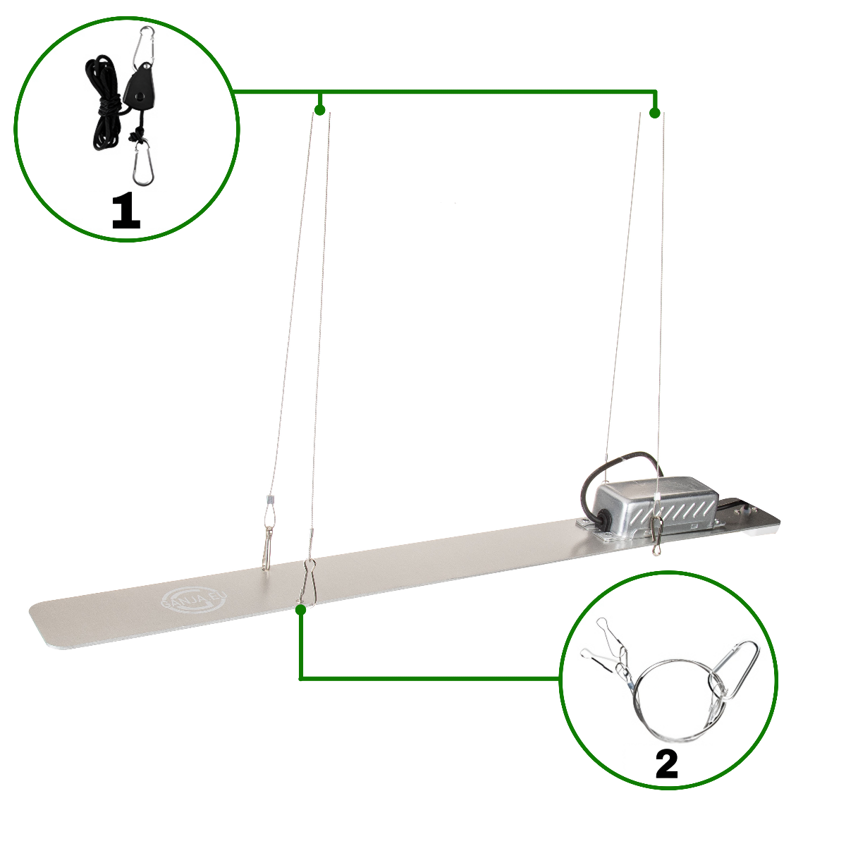 Unsere Leuchten werden mit Stahlseilen geliefert, die an einem Punkt mit einem Textilkabel verbunden sind. Dieses ist wiederum mit einem Schnellverstellsystem für die Pendelhöhe ausgestattet. So können Sie schnell die passende Pendelhöhe für das aktuelle Wachstumsstadium Ihrer Pflanze wählen.